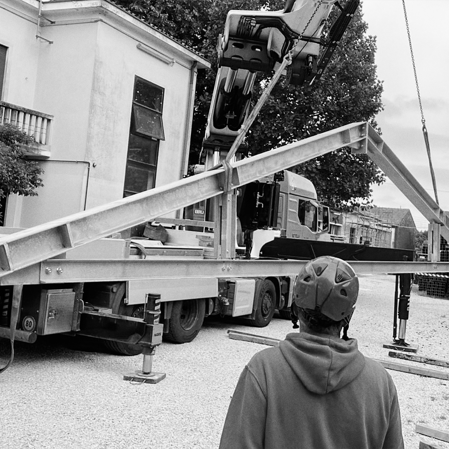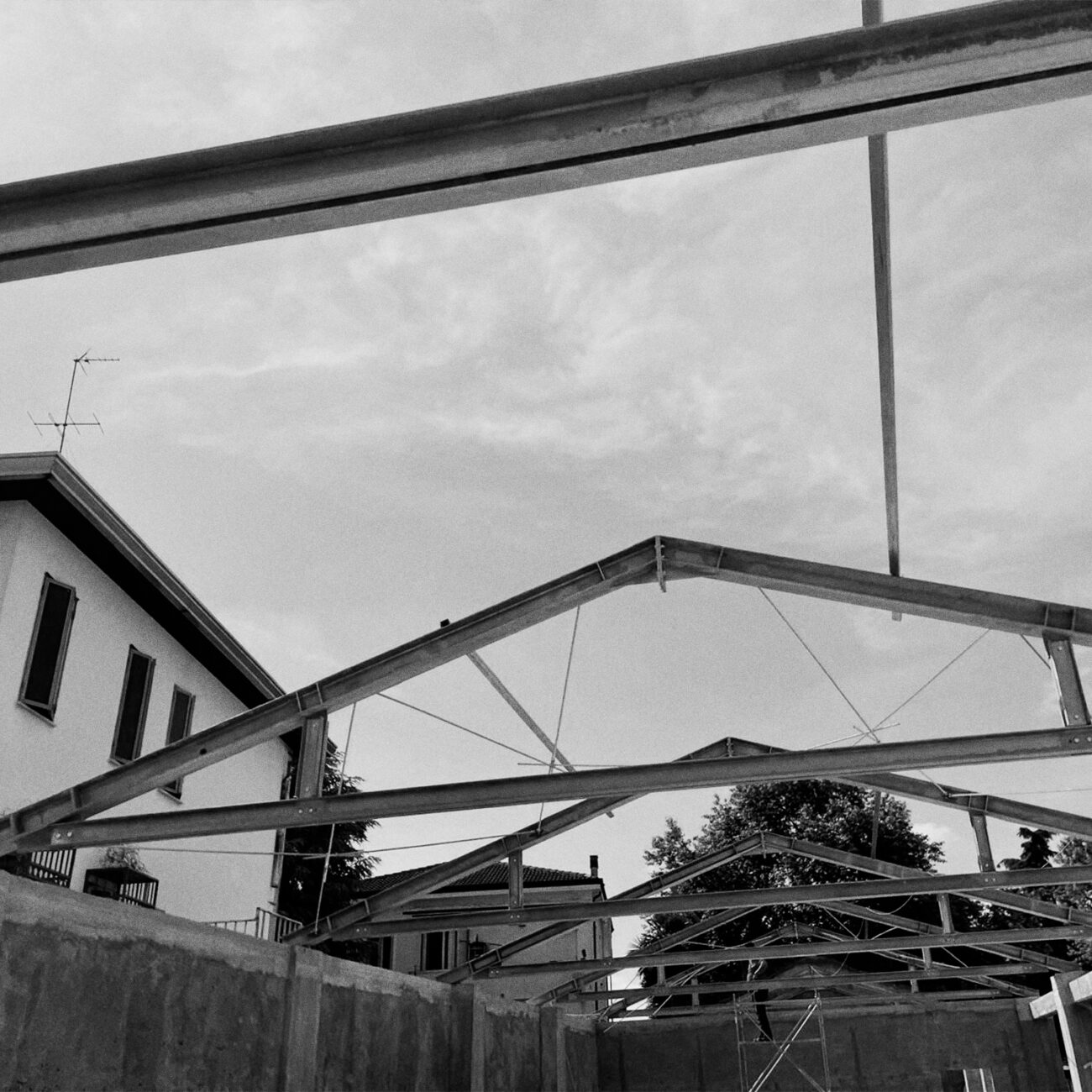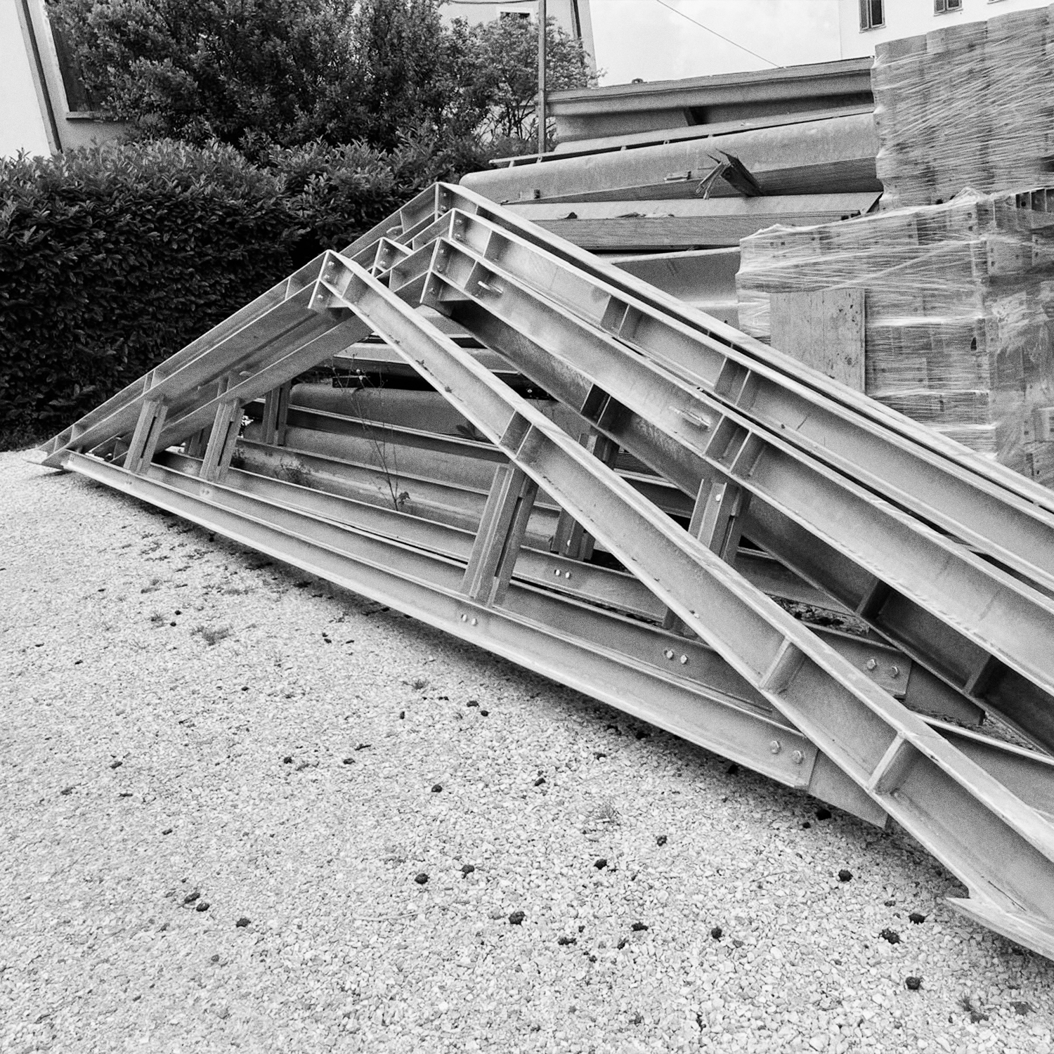 realizzazione e montaggio struttura in ferro. Realizzazione delle capriate in officina e in seguito a trasporto, montaggio in sede